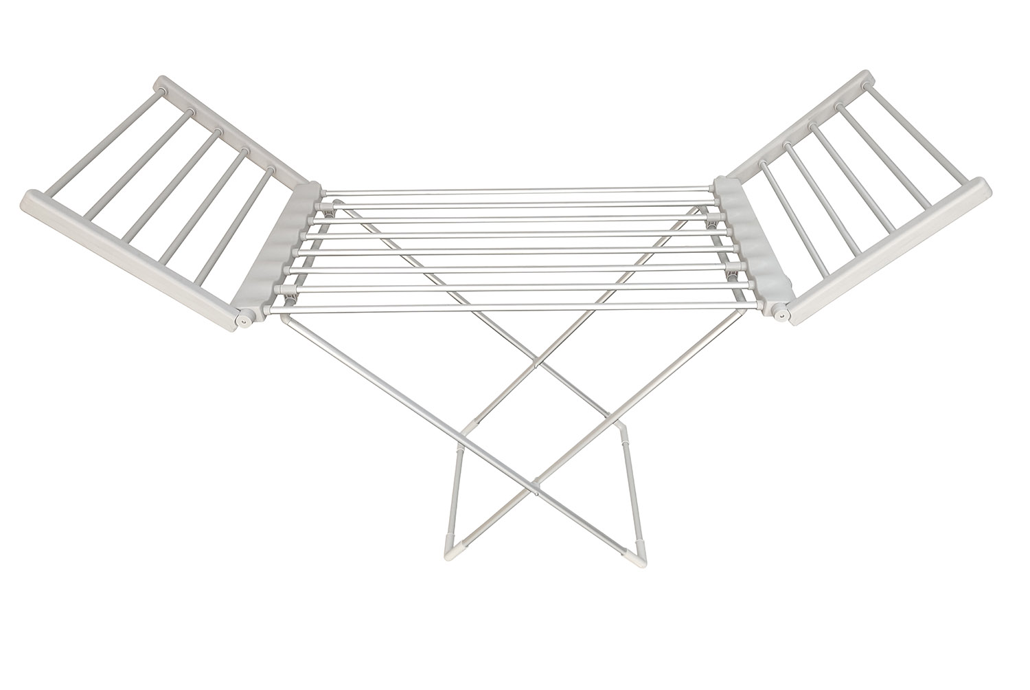 折疊電熱晾衣架 Folding electric drying rack 材質Material:Space aluminum and PP plastics 太空鋁+PP塑料 功率Power:220V/200W 表面Surface:Silver Oxide 氧化銀 尺寸Size:1450*520*930mm 包裝Ctn size:550*70*980mm