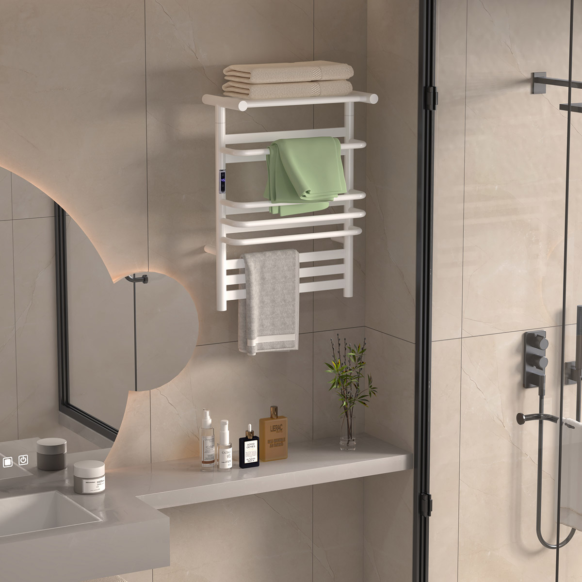 15桿時(shí)控開關(guān)電熱毛巾架 15 bar time switch heated towel rail 材質(zhì)Material:SS201/SS304 功率Power:220V/220W 表面Surface:White Painted 白色噴塑 尺寸Size:500*250*680mm 包裝Ctn size:560*310*745mm